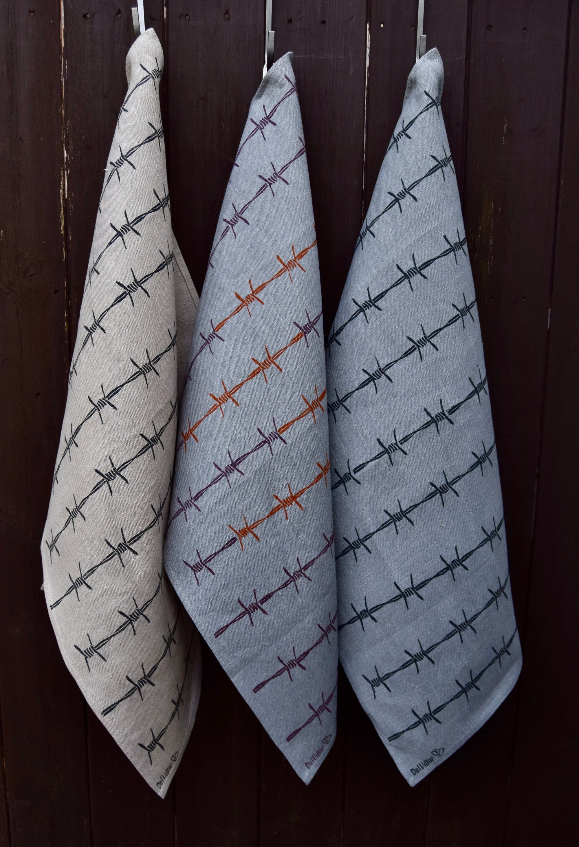 Hand made and Hand block printed linen tea towel in 100% linen with a barbed wire pattern in a choice of colour.
